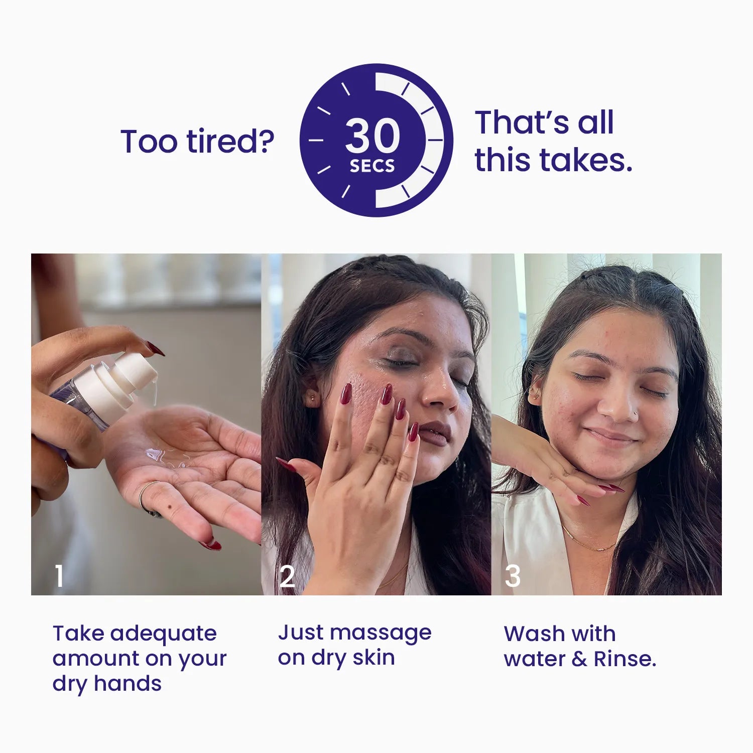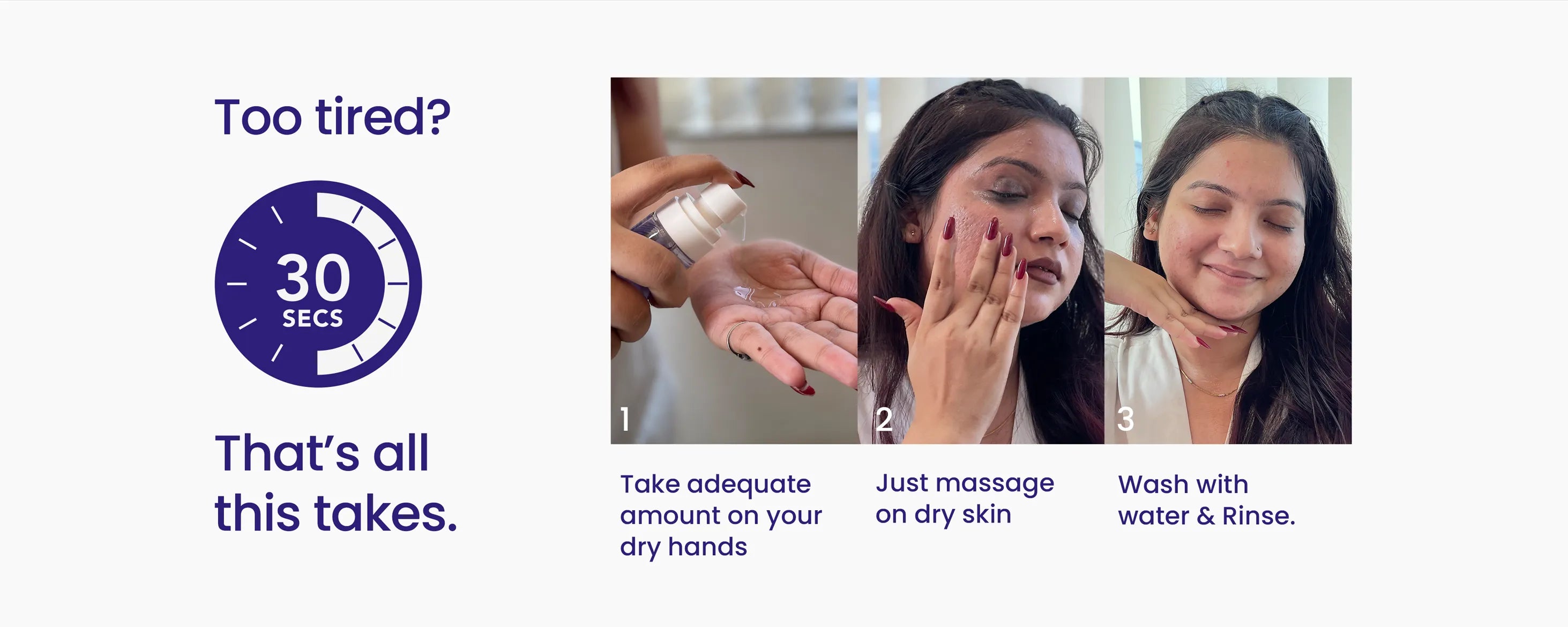 Massage an adequate amount on dry skin or makeup-worn skin. Rinse with water—the cleanser emulsifies into a milky texture. Follow up with your regular skincare routine or a second cleanse if needed.