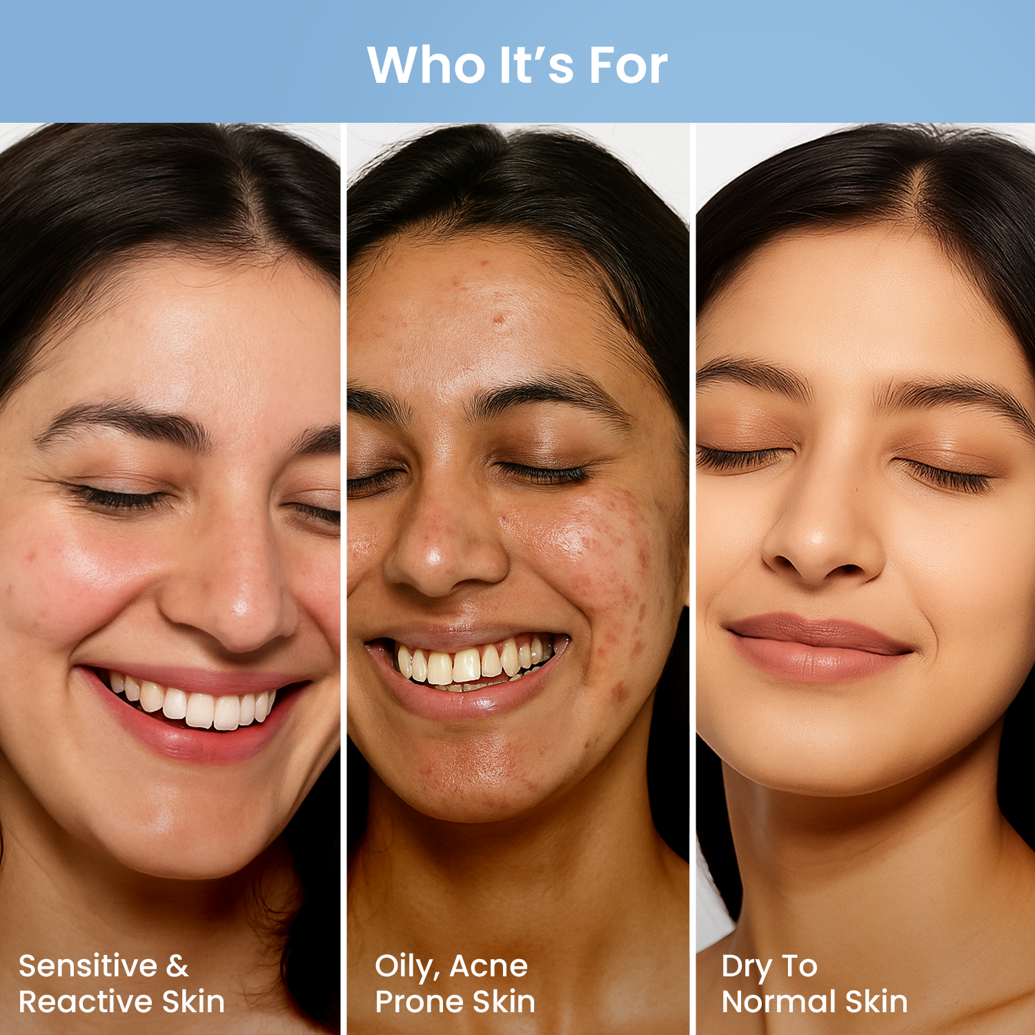 Sensitive skin, acne-prone skin, reactive skin, combination skin, dehydrated skin