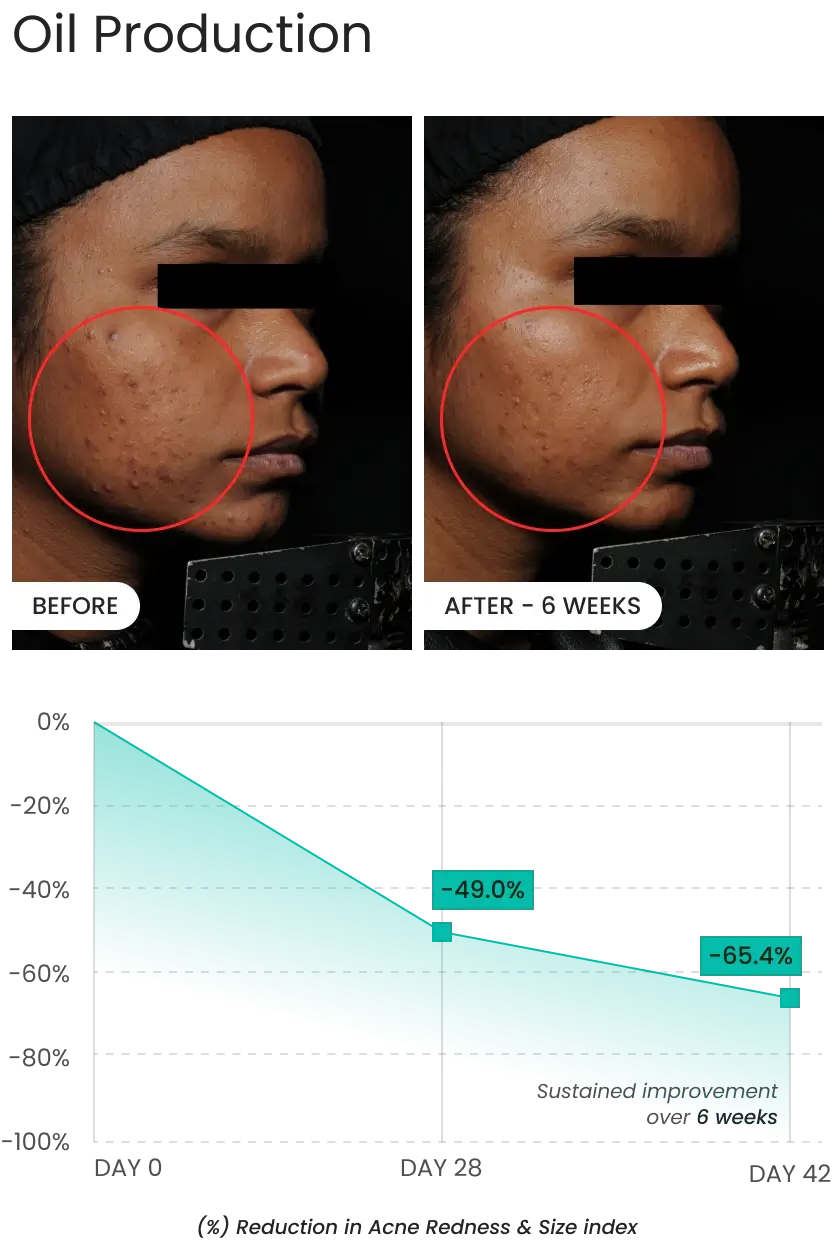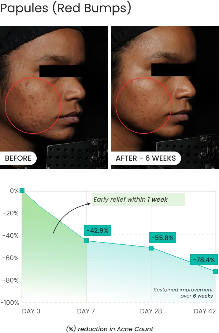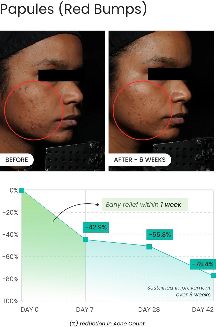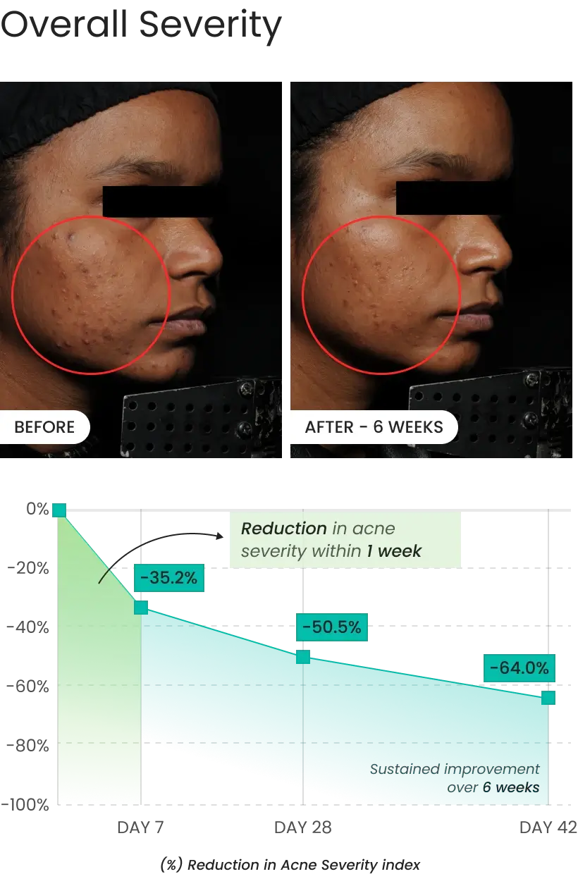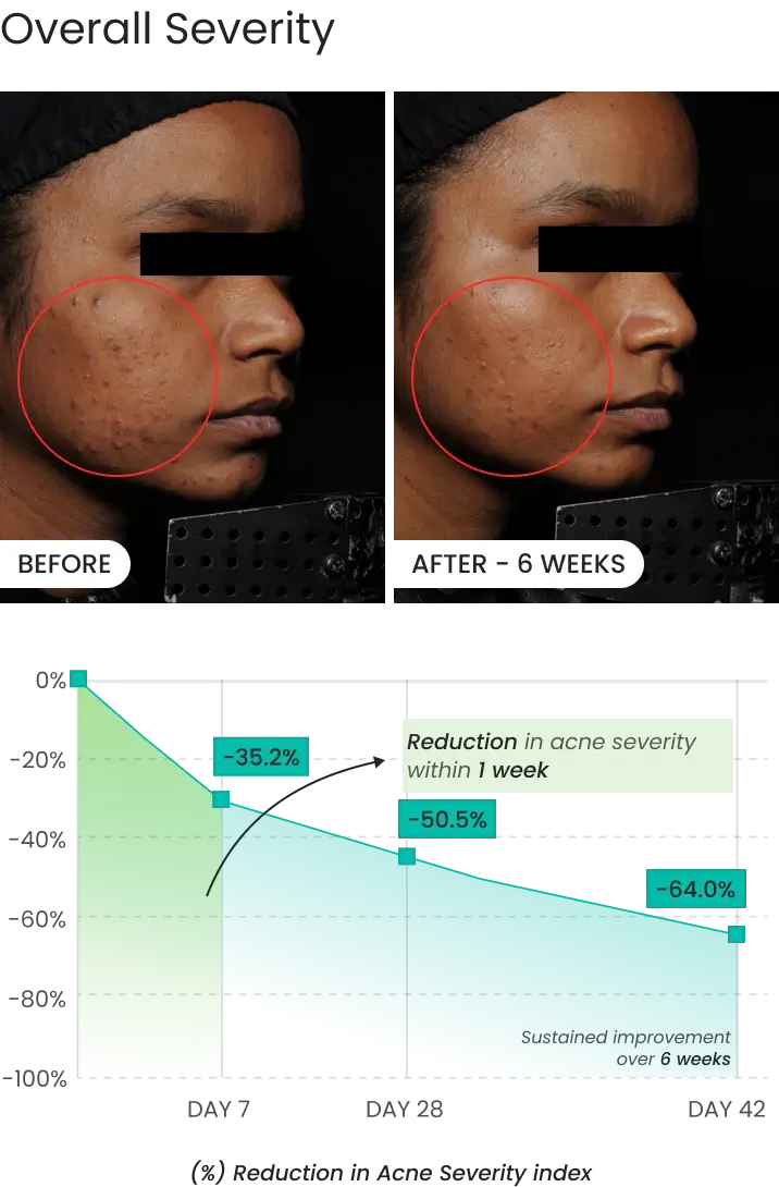 - Up to 64% reduction in overall acne severity by Week 6.
